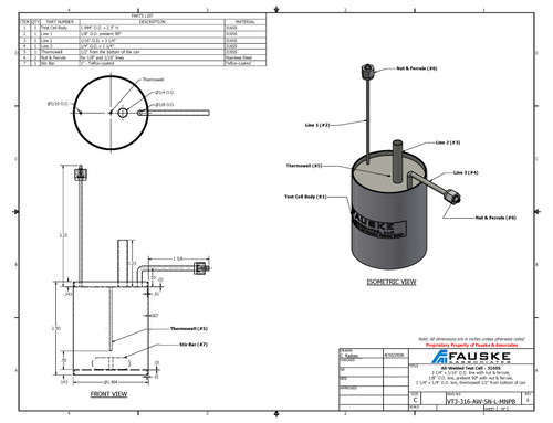 Description All-Welded VSP2 Test Cell, 3 lines, 316SS 3 1/4" x 1/16" OD line with nut & ferrule, 1 1/4" x 1/4" OD line, 1/8" O.D. prebent 90 degree line, thermowell, 1" Teflon-coated stir bar